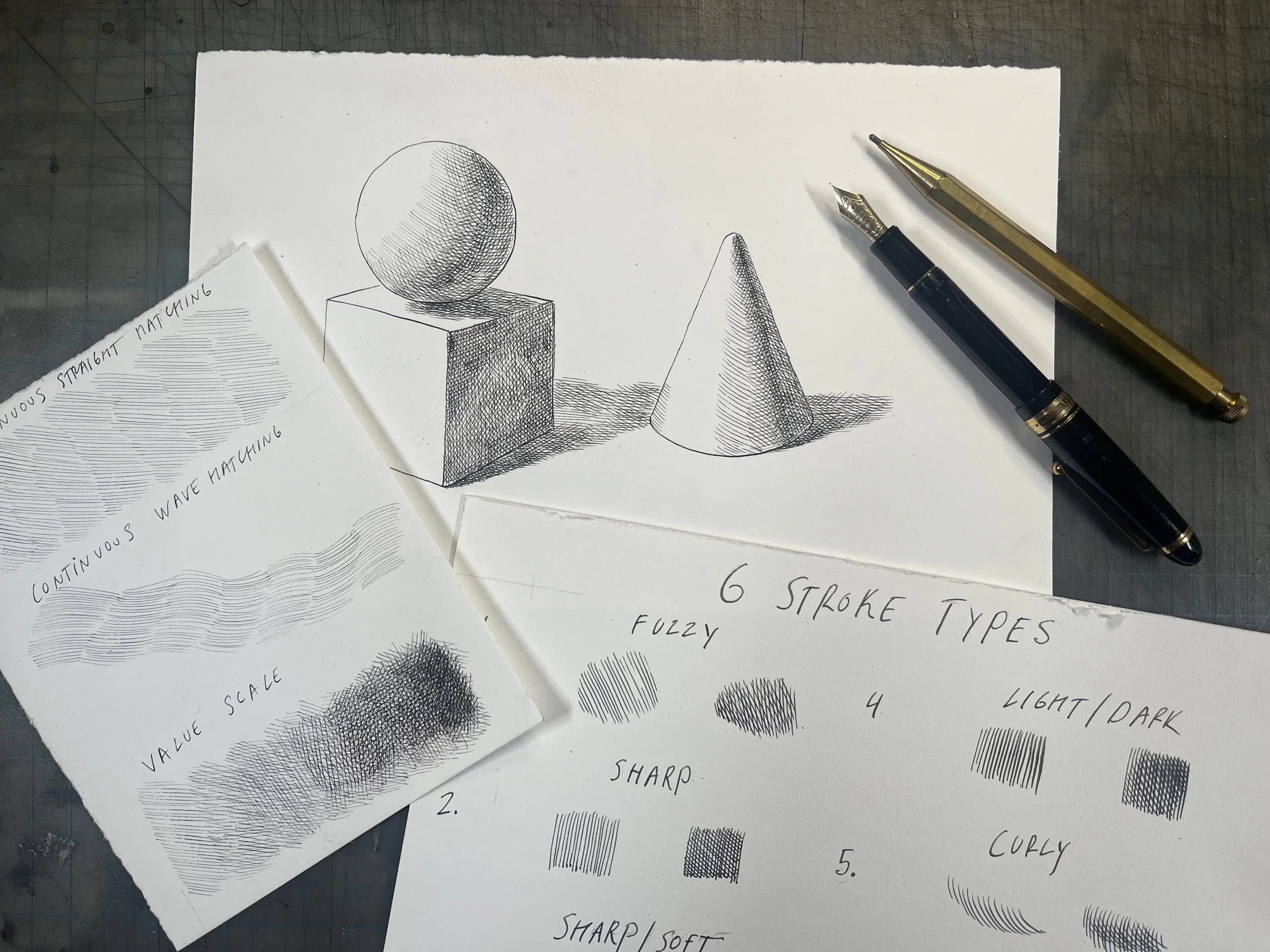 I’m going to cover the 6 types of hatching strokes commonly used in cross-hatching, show you three extremely useful exercises for developing your dexterity with the pen, and lastly demonstrate how to apply these various skills by doing a drawing of these deceptively simple geometric forms. And, as a bonus, once the workshop is over, I’ll give you the opportunity to submit your drawings for individual critique.